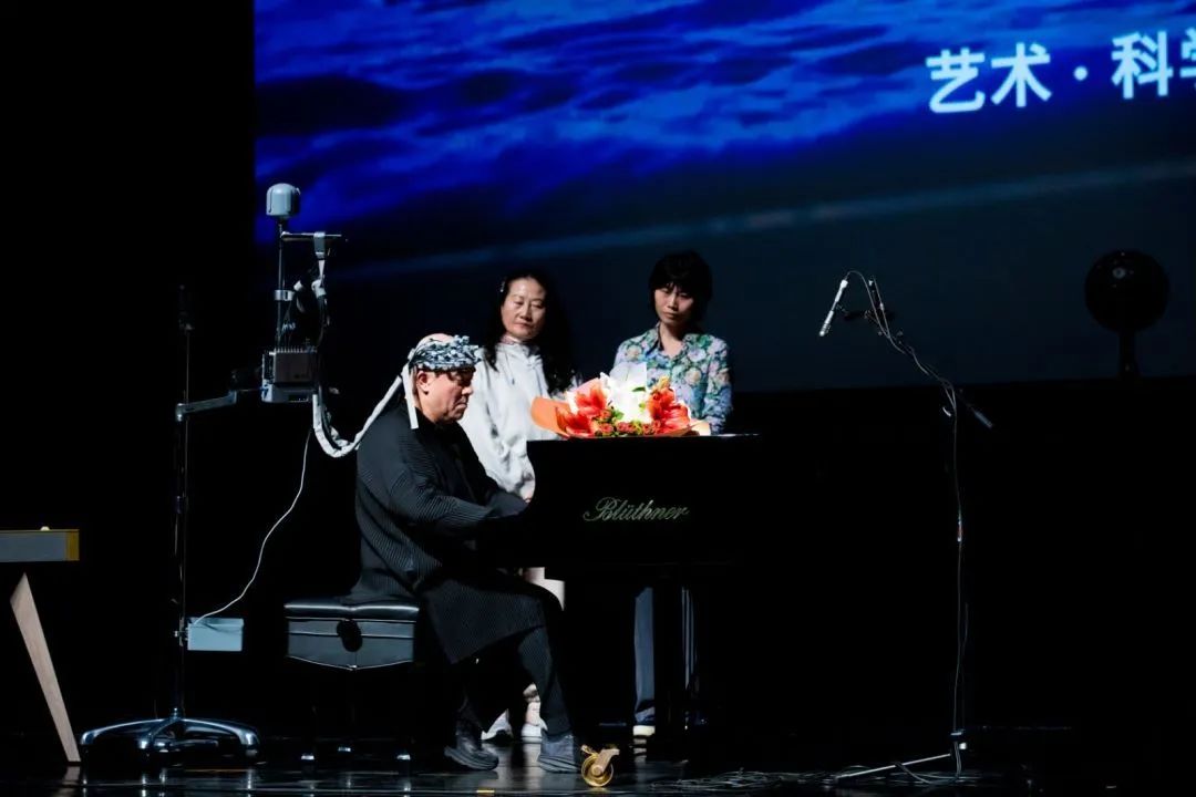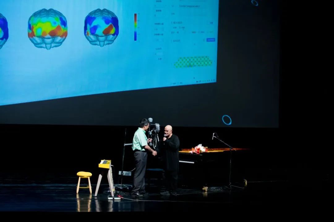 本場(chǎng)音樂(lè)會(huì)也得到了清華大學(xué)腦與智能實(shí)驗(yàn)室(簡(jiǎn)稱THBI)的深度參與,將音樂(lè)腦科學(xué)實(shí)驗(yàn)搬到了劇場(chǎng),用近紅外光譜腦功能成像設(shè)備同步記錄了孔祥東先生與臺(tái)下六位聽眾的大腦活動(dòng)。音樂(lè)會(huì)結(jié)束,THBI首席科學(xué)家王小勤教授上臺(tái)與觀眾分享了音樂(lè)腦科學(xué)的相關(guān)知識(shí)以及現(xiàn)場(chǎng)所采集的最新圖像,希望探究藝術(shù)家即興創(chuàng)作這一富有創(chuàng)造力的活動(dòng)以及作為觀眾在審美過(guò)程中的大腦機(jī)制。作為被研究對(duì)象,孔祥東先生表示,自己非常有意愿持續(xù)參與音樂(lè)腦科學(xué)的相關(guān)研究,希望可以與科學(xué)家們共同攜手一起探索音樂(lè)與人類大腦的關(guān)系。