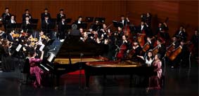 此次的雙鋼琴與交響樂(lè)隊(duì)合作,規(guī)模之大,曲目之多,這在大連尚不多見(jiàn)。兩位鋼琴家演奏的莫扎特的《降E大調(diào)雙鋼琴協(xié)奏曲》,德彪西的雙鋼琴《小組曲》及中國(guó)作曲家崔世光的雙鋼琴協(xié)奏曲《喜慶中國(guó)》等,都給觀眾帶來(lái)了耳目一新的感覺(jué)。