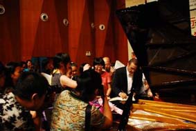 此次參加音樂會的觀眾大多是學生家長及學琴小朋友,由于有些小朋友年紀還很小,工作人員開始還有擔心現場秩序,但是當鋼琴家亞歷山大·帕雷演奏開始,現場便寂靜無聲,這讓亞歷山大·帕雷非常驚訝,直到上半場他與夫人陳佩雯女士四手聯彈結束之際,現場爆出經久不息的掌聲一直持續(xù)到主持人宣布中場休息。下半場雖然曲目演奏時間較長,但是一直到演出結束之前,場內一直都保持著安靜,直到演奏結束,現聲才爆發(fā)出雷鳴般且經久不息的掌聲。鄭州小琴童位都爭先恐后的涌上舞臺與這位帶給他們神奇視聽的大師合影留念。其中有一位小朋友讓亞歷山大·帕雷夫婦非常欣賞,還特別在現場進行了一番指導,這讓其家長及老師欣喜不已,但由于時間有限,亞歷山大·帕雷在工作人員的陪同下迅速消失在人群中,鄭州觀眾的熱情讓鋼琴家欣喜不已.帶著這種心情,我們很快便踏上了去往最后一站南京的旅途中。。。