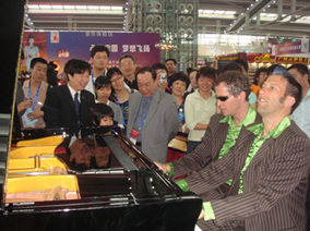 德國國寶-博蘭斯勒鋼琴作為此次文博會演藝館主要參展商之 一,德國博蘭斯勒鋼琴(中國)有限公司非常重視此次活動的推 廣,不但把旗下四大品牌博蘭斯勒、歐米勒、海斯勒、塞勒的最經(jīng) 典、奢華款式搬到了文博會會場,還邀請了德國博蘭斯勒系列品牌 之一的歐米勒品牌形象代言人、2007-2008德國十大杰出鋼琴家 、表演藝術(shù)家歐米勒孖寶組合到現(xiàn)場進(jìn)行鋼琴表演。會展期間,中 國樂器協(xié)會王根田會長及廣東樂器協(xié)會會長原珠江鋼琴集團(tuán)懂事長 童志成先生在廣東樂器協(xié)會李愛群副會長的陪同下來特別到博蘭斯 勒會展現(xiàn)場參觀指導(dǎo)工作,并高度贊揚(yáng)了博蘭斯勒鋼琴(中國)有 限公司市場推廣及宣傳工作做得非常好,如近期舉辦的“博蘭斯勒 攜手《鋼鐵俠》看大片 贏大獎”活動,很有新意,這非常值得中國 樂器企業(yè)學(xué)習(xí)。在博蘭斯勒展位上兩位會長還饒有興趣的欣賞了歐 米勒孖寶的無比精彩的瘋狂鋼琴表演。