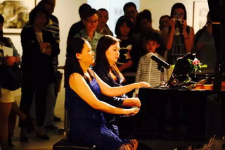 17日畫(huà)展現(xiàn)場(chǎng),主辦方同時(shí)邀請(qǐng)了上海音樂(lè)學(xué)院旅歐青年鋼琴家唐瑾,朱和,謝亞雙子,江瀅攜手德國(guó)國(guó)寶博蘭斯勒旗下歐米勒鋼琴共同演繹書(shū)法與鋼琴的對(duì)話(huà)。