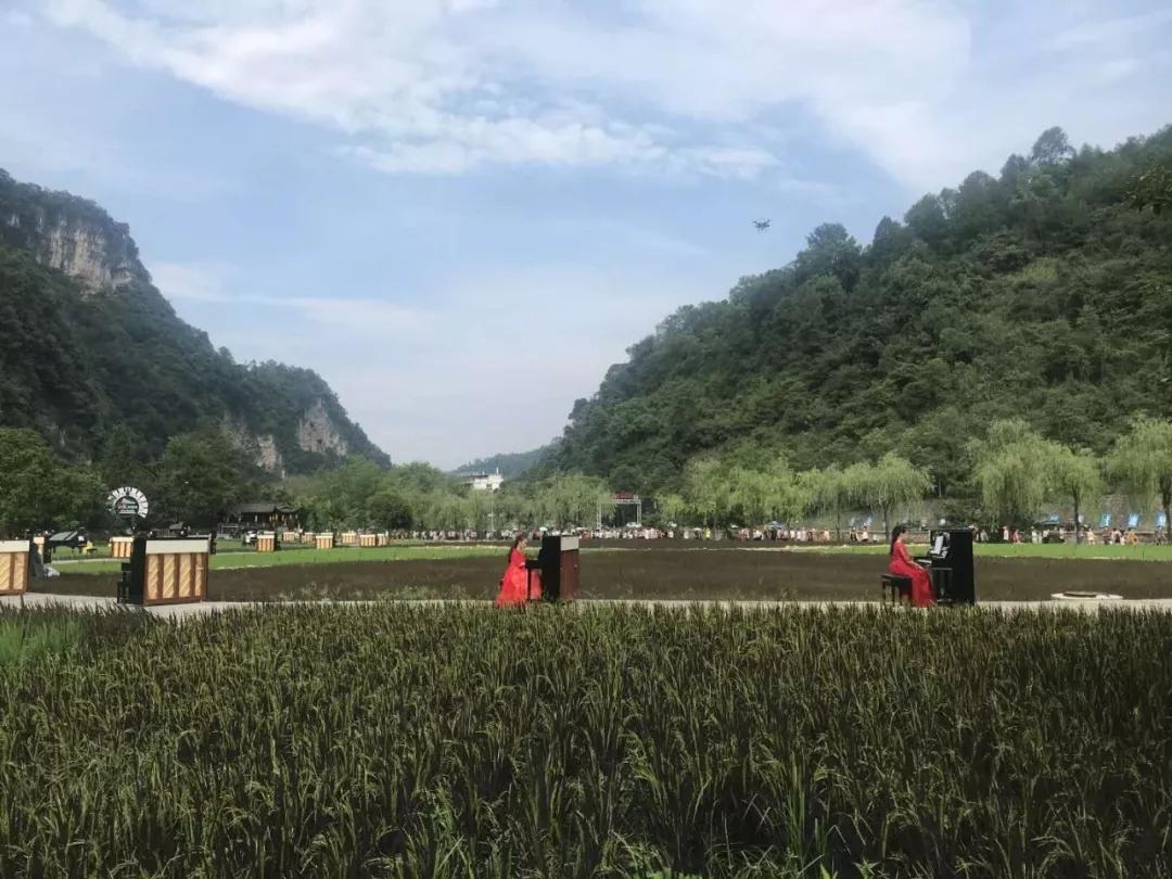 在中國(guó)著名鋼琴家元杰的磅礴詮釋下,博蘭斯勒的黃金音色在被陽(yáng)光照耀的天子山巔被奏響;與此同時(shí)在相隔15公里的黃龍洞景區(qū),在微風(fēng)拂過(guò)的哈利路亞音樂廳的綠茵屋頂上;在一片金黃盡收眼底的曲折綿延的稻田中,在蜻蜓喚醒的八角亭內(nèi),在溪水推動(dòng)的水車旁,這整片過(guò)百平方公里的天然舞臺(tái),118架博蘭斯勒家族鋼琴與演奏者,共同奏響這場(chǎng)世界獨(dú)有的峰林音樂會(huì)!