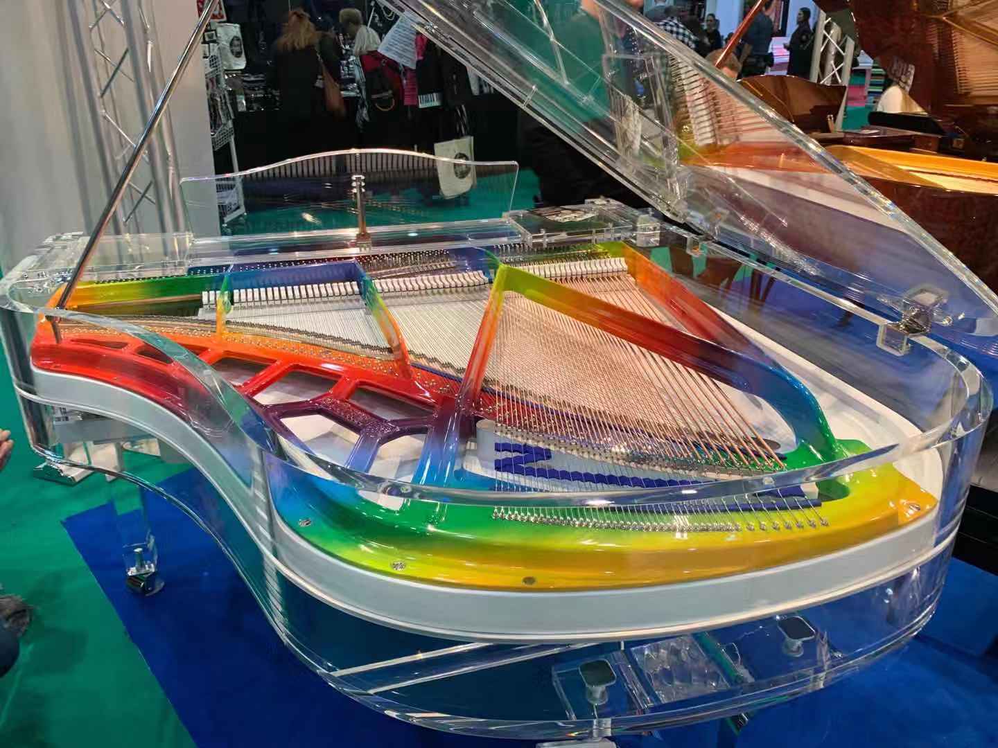 在現(xiàn)場(chǎng)眾多令人目不暇接的常規(guī)型號(hào)與定制型號(hào)中,最為奪人眼球的莫過(guò)于現(xiàn)場(chǎng)的一架博蘭斯勒水晶詩(shī)意定制系列——“彩虹之上”。區(qū)別于市面上其他的水晶鋼琴,Blüthner重新定義了如何打造一架真正完全透明的三角鋼琴。摒棄了所有厚重的木支架與不計(jì)其數(shù)的略顯古板的螺栓,以全透明材質(zhì)打造。除了鋼琴的音板之外,從鋼琴的頂蓋、外框、音板邊框到所有的鍵盤(pán)檔、琴譜架、琴鍵蓋、琴腿均有透明材質(zhì)精心打磨而成。透過(guò)晶瑩通透的琴身,如同陽(yáng)光照射通過(guò)了晶瑩靈動(dòng)的水滴,光線被折射在天空上形成七彩的光譜——展現(xiàn)在面前的是宛如盛滿了七彩顏料水彩畫(huà)板的鐵支架。