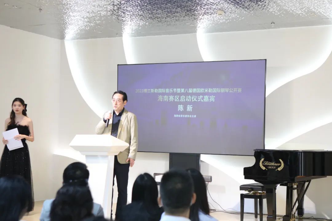 開(kāi)場(chǎng),主持人傅莉莎介紹德國(guó)博蘭斯勒鋼琴和2023博蘭斯勒國(guó)際音樂(lè)節(jié)暨第八屆德國(guó)歐米勒國(guó)際鋼琴公開(kāi)賽海南賽區(qū)詳情。隨后,海南省音樂(lè)家協(xié)會(huì)主席陳新教授、海南大學(xué)音樂(lè)與舞蹈學(xué)院鋼琴系主任吳春丹副教授先后為比賽致辭。