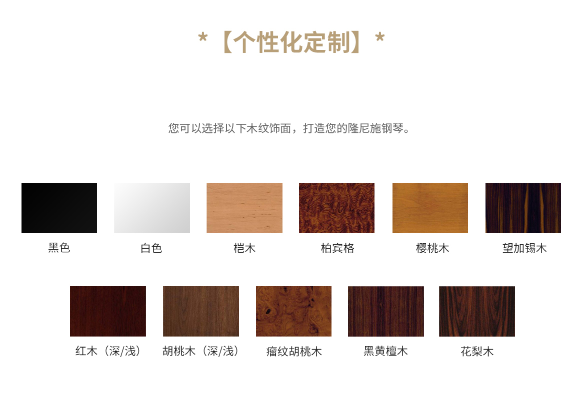 每臺鋼琴均接受定制,可根據(jù)您的品味或需求指定特殊飾面與個(gè)性化裝飾。從典雅的鑲木板材與手工雕刻鑲嵌工藝,到最具創(chuàng)新性的現(xiàn)代藝術(shù)造型,博蘭斯勒皆可助您實(shí)現(xiàn)美學(xué)構(gòu)想。